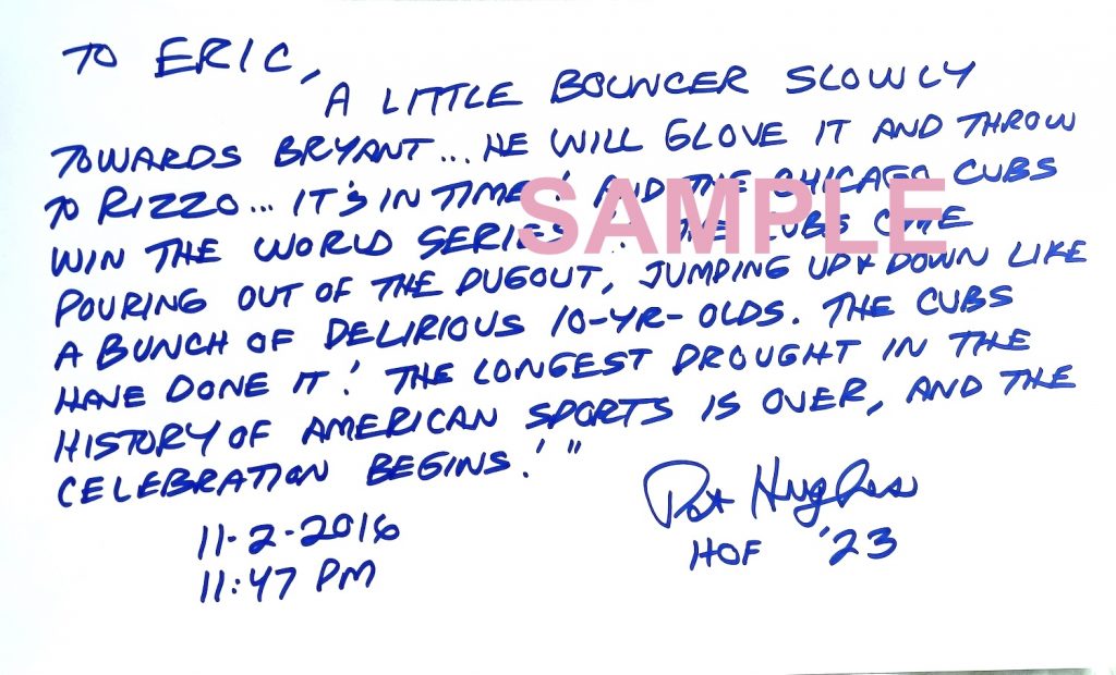 100 % handwritten version of the last play of this historic game. Personally signed by Pat with the date and time of this milestone event.