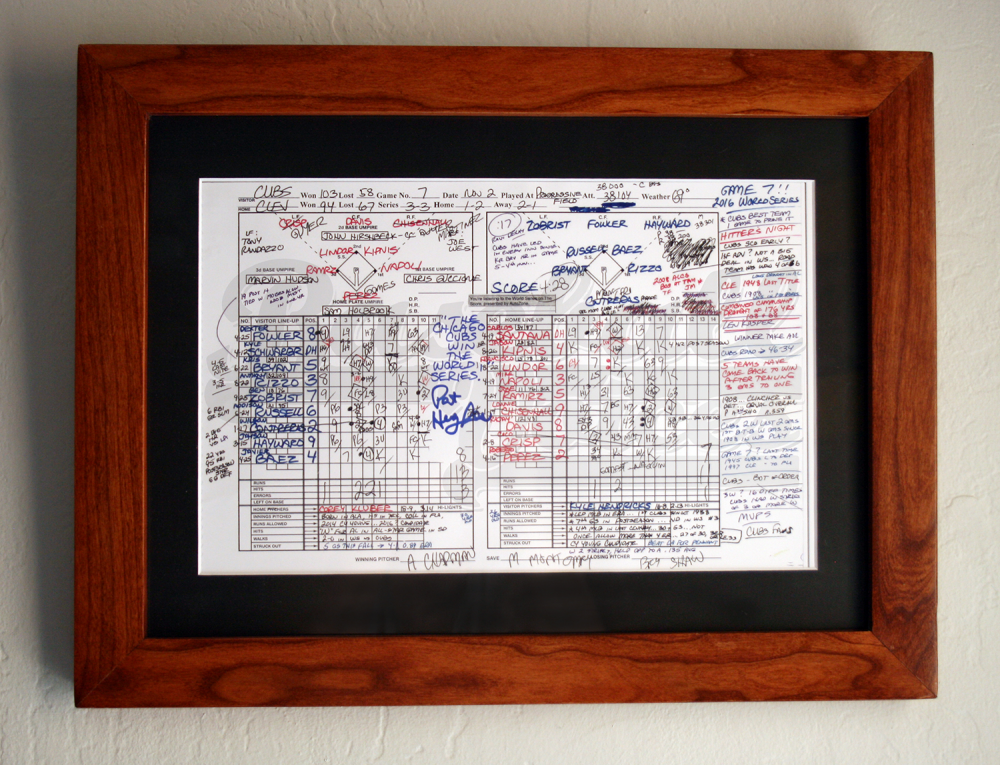 A copy of Pat’s scorecard from Game 7 of the 2016 World Series. The Cubs first championship since 1907.
